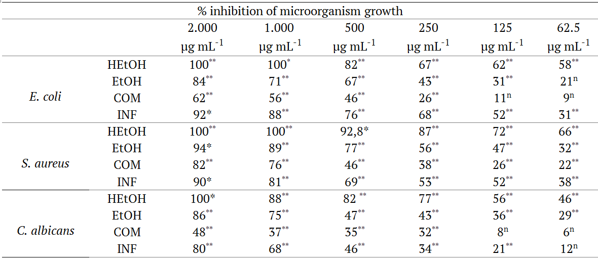 Table 2 shows the percentage of inhibition for microorganism growth. The HEtOH extract showed a MIC of 1.000 µg mL-1 for E. coli, 500 µg mL-1 for S. aureus and 2.000 µg mL-1 for C. albicans, being S. aureus the most sensitive pathogen to the extract, and C. albicans the most resistant. While the other extracts did not present inhibition of 100% of the microorganisms and under a 2.000 µg mL-1 concentration, all extracts reached an inhibition of at least 50 % (IC50).