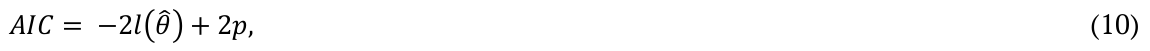 with l() being the logarithm of the likelihood function applied to the estimator of maximum likelihood of θ, () and p the number of explanatory variables. Thus, the satisfactory model will the one with the lowest AIC statistical value.