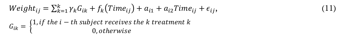 in which yij indicates the response variable, () = 1+2+, in which 1, 2 denote the random effects, and () is a smoothing function that explains the trajectory of each individual, and indicates the i-th sampling unit observed at the j-th instant, and the k index indicates the k-ith treatment group. Besides, the fxij function is estimated using P-splines, which can be rewritten in the context of mixed model; besides: