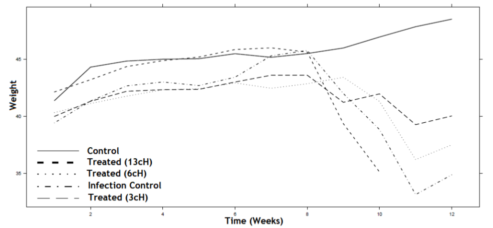 As for the result, it is possible to conclude that the weight, until the 6th week, of the animals treated with a dilution level of 13cH of biotherapeutic serum is superior to that of the other treatment groups. Concerning the animals treated with a dilution level of 3cH of biotherapeutic serum, they reached the end of the study, with average weights greater than those of the animals treated with a dilution level of 6cH of biotherapeutic serum.