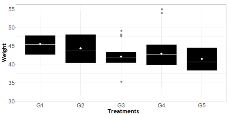 It is also possible to see a difference as to the maximum and minimum values for the weights in each one of the treatment groups; the minimum weights of the individuals allocated in the homeopathic treatment group with 3cH dilution (G5) is 31.00 g, whereas the minimum weight of the individuals in the Control treatment group (G1) is 39.20 g; as for the maximum weight, it ranges from 55.00 g, representing the 'Infection control' group of individuals (G4), to 49.20 g, representing the group under homeopathic treatment with 6cH dilution (G3). Finally, about the coefficient of variation, there is a small oscillation, with values ranging from 0.076 g and 0.106 g, approximately.