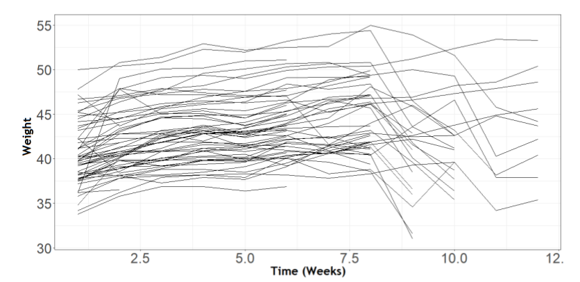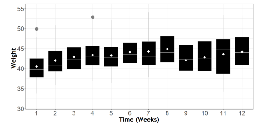 Figure 2 presents the behavior of the response variable as a function of time, with the weight showing an increase behavior over time and oscillating as of the sixth week. Another remarkable fact was to find potentially outlier measures in the first week and in the fourth week of monitoring.