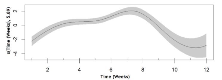 Observing Table 2 allows concluding that the model to be selected is the one with the AR(1) correlation structure, since it provides the lowest value for the AIC statistics; in addition, this structure allows improving the fit of the curves both for the independent variables and the dependent variable. Figure 5 contains the chart for the smoothed curve of the Time covariable after the determination of the correlation structure; it is possible to see that the Weight evolution presented an increase behavior until the 7th week approximately and, after this period, it decreased until the 12th week; as a consequence, the effect of this covariable follows a non-linear pattern.