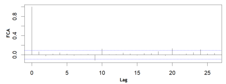 Figure (6) displays the correlogram with the AR(1) structure in the residuals; it is possible to see a significant portion of the autocorrelation values contained within the significance levels, that is, there is a decrease in the issue found as to the assumption of independence in the residuals of the model without considering a correlation structure.