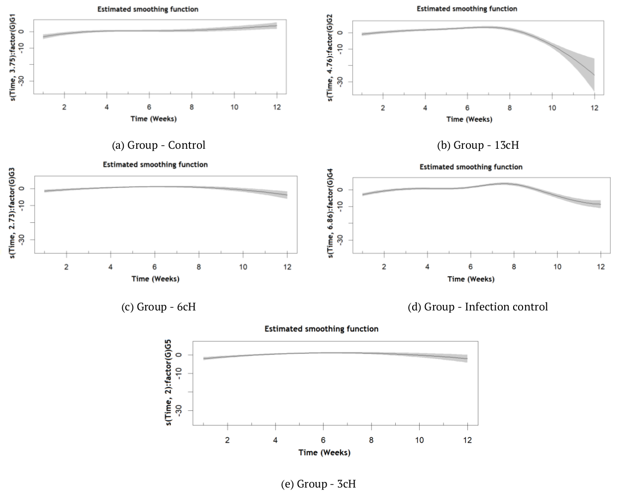 Figure 7 shows the behavior of the estimated smoothing non-parametric functions of model 11 for each treatment group; the continuous line is the estimated smoothing function, and the gray line represents the ranges with 95% confidence. Because the effect of the Time variable for each treatment group is not linear, the estimated smoothing functions are significant with 3.751, 4.763, 2.726, 6.864 and 2.000 effective degrees of freedom. Additionally, the evolution of the weights over time has a period of increase until the 7th week approximately in the groups under homeopathic treatment with 13cH dilution (Figure 7b), 6cH dilution (Figure 7c), and 3cH dilution (Figure 7e) with the passing of time; as for the Non-infected control group (Figure 7a) and the Infection control group (Figure 7d), there is a slight rise in the beginning of the treatment, with an oscillation as of the 2nd week. Figures 7b and 7d show a significant decrease, thus evidencing that the animals lost weight after said period.