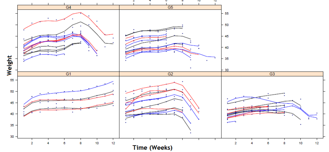 It is also possible to notice that the weight gain of the mice in each treatment group varies greatly between the intercept and the slope of the lines that have been fitted; this allows considering mixed models with random effects, be they independent or correlated between intercept and slope in relation to time – in this case, for the Time covariable.