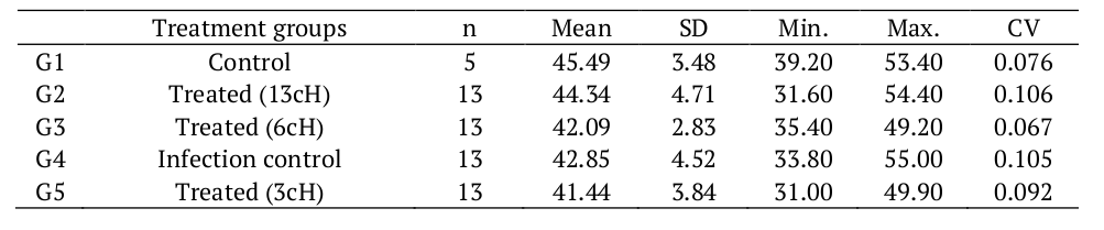 Observing Table 1 allows concluding that the mean of the weights in relation to each one of the treatments is 45.49 g for the 'Non-infected control' treatment group, and 41.44 g for the individuals allocated in the homeopathic treatment with 3cH dilution.