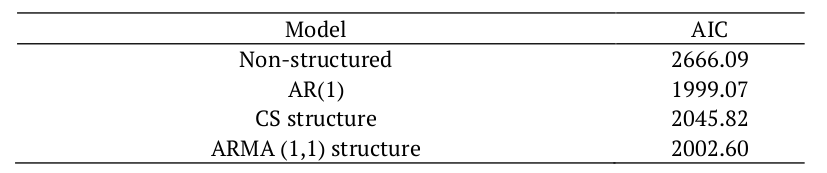 Table 2 displayed the fitted models, considering different structures of variances and covariances, defined by: a model without considering a correlation structure in the errors, and three other models using the AR(1), CS and ARMA(1,1) correlation structures. For model selection, the Akaike criterion was used.