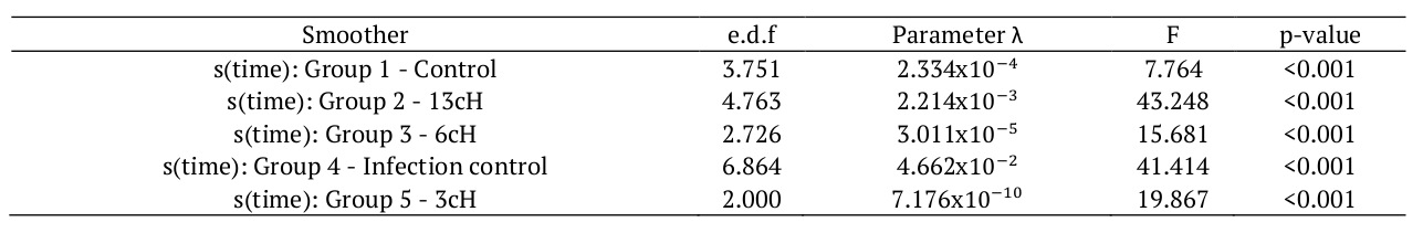 Table 3 contains the estimates for the λ parameter, with their respective effective degrees of freedom (e.d.f), F test, and p-value. It can be concluded that the smoothing of the Time covariable for each homeopathic treatment group was highly significant in relation to Weight evolution.