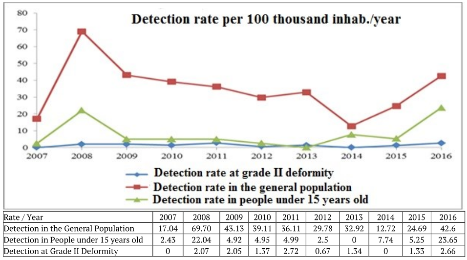 A historical series of notified leprosy cases from 2001 to 2016 in the municipality of Parnaíba showed that there were 771 cases, with an average detection rate of 33.50 cases 100,000 inhabitants-1. Comparing 2001 with 2016, there was an increase in the detection rate from 54 to 64 new cases per 100,000 inhabitants (Araújo et al., 2016).
