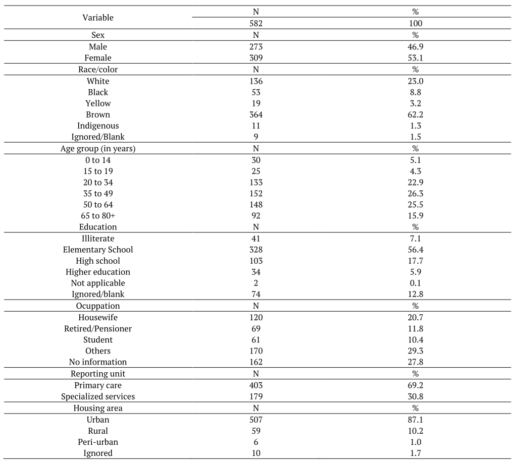 As for occupation, 20.7% were housewives. Similar findings were reported by Cid, Lima, Souza and Moura (2012) in Fortaleza, State of Ceará, and Reis, Raposo, Alencar, Ramos Júnior and Heukelbach (2018) in Vitoria da Conquista, State of Bahia. Attention is drawn to the fact that the occupation of a housewife is related to low schooling and, consequently, to poverty.