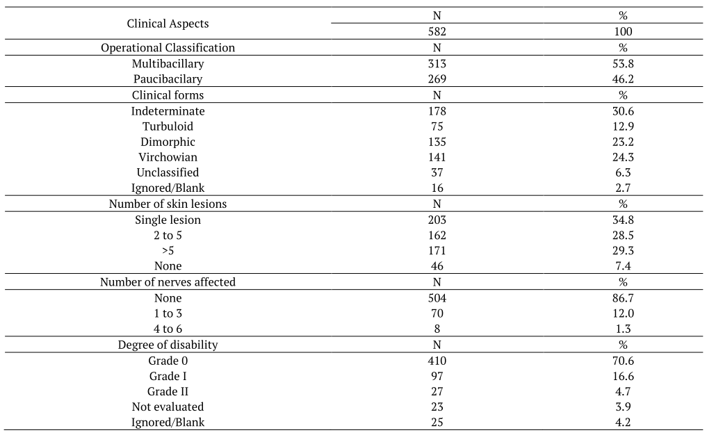 As for the clinical form, the indeterminate form was found with 30.3% (Table 2). Gomes et al. (2017), in Floriano, State of Piauí, found the indeterminate form in 58.6% of the cases. While in a reference center in Fortaleza, State of Ceará, the predominant form was the dimorphic, 68.9% (Moura et al., 2016), a finding that can be justified by the fact that the study site is a specialized service. Virchowian and dimorphic forms represented 47.5% cases (Table 2). These clinical forms are characterized by higher severity and greater risk of contamination, requiring immediate interventions to break the transmission cycle to contacts and cohabitants (Holanda, Giló, Silva Junior, Soares, & Cerdeira, 2018). When comparing filling in information on operational classification with filling in the clinical form, it is clear that the operational classification was completed in 100% cases - probably because it is a mandatory field of the leprosy notification/investigation form and linked to the type of treatment to be instituted. While the unclassified or ignored/blank clinical form represented 9% cases (Table 2).