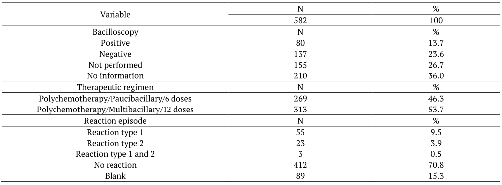 Regarding the occurrence of a reaction episode, 81 patients (13.9%) had some type of reaction during treatment. Of these, 55 (67.9%) had a type I reaction (Table 3). Cunha, Xavier, Pires and Oliveira (2013) in a study in Belém, State of Pará, found a higher frequency of type I reaction among those who did not adhere to the treatment (66.7%) and 57.1% among those who adhered. It is worth mentioning that these reactions can occur before, during and after the completion of polychemotherapy.