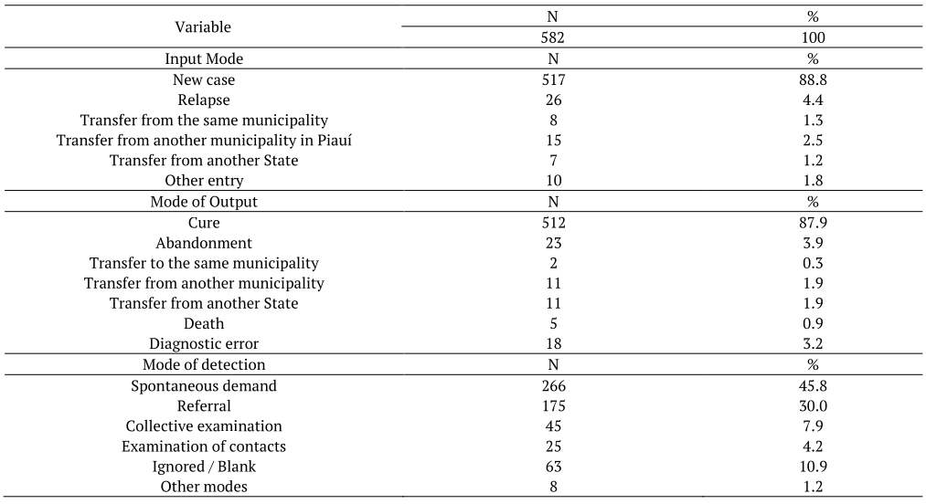 Regarding the mode of input, 88.8% were new cases (Table 4). Similar data were reported in Bahia, 86.5% (Costa, Pfrimer, Menezes, Nascimento, & Carmo Filho, 2019); while in São Luís, State of Maranhão, 58.3% were found (Pacheco, Aires, & Seixas, 2014). Therefore, it is deduced that the number of new cases registered is due to the improvement of early detection of cases in health services, which can lead to an increase in notifications and treatment of cases.