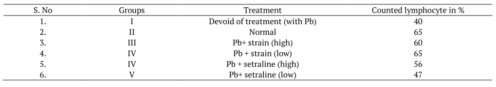 This study, provides a range of 47-65% where, the highest was seen in the normal groups persuaded by the Lactobacillus high concentration. However all the treated groups showed an increase count in the lymphocyte when compared to the lead induced sample. This suggests that the injection of bacterial isolate and sertraline had some immunostimulatory effect, possibly through the external mucous layer into the body cavity. These expanded percentages could represent large lymphocytes plasma blasts with expanded Golgi bodies (Bennett et al., 2001). The shift toward higher percentages of lymphocytes corresponds to an immunomodulatory effect on the toxic heavy metal. Histopathology has been widely used as biomarker in assessing the health of toxin exposed brain cells. This study showed that brain cells are severely damaged when exposed to lead when compared to control groups. Conversely, the treated groups with low dosage of lactobacillus isolate and Sertraline restored necrosis to certain extent.