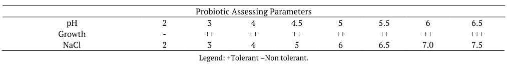 Assessing probiotic propertyThe probiotic properties of the isolated lactobacilli was determined by analysing it’s resistance to sodium chloride and low-pH. The tests were performed in accordance to the protocol of Liong and Shah (2005) with minor modifications as, cited by Chowdhury et al. (2012). The bacterial isolate was grown (for 24h at 37ºC), in nutrient broth with sodium chloride supplementation with a run of concentration (2,3,4,5,6,6.5,7,7.5 and 8%,) and then sub cultured on agar (24h at 37ºC). The resistance of the bacterial isolate to low pH was analysed by suspending the overnight cultures (h) viability. The tests were conducted under atmospheric carbon dioxide, and were 18 replicated twice.