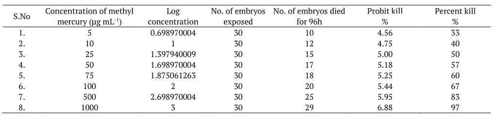 Embryonic degeneration studies were performed on eggs of Danio rerio in accordance to the protocol of Meyers (2018). A series of varied concentrations of 6 different test samples as mentioned in the Table 1 was taken for experimentation.