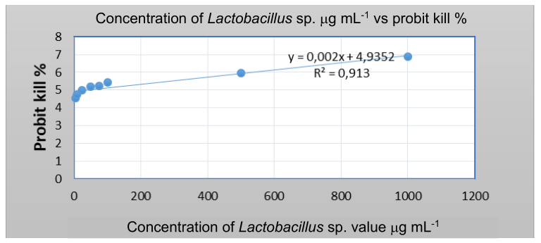Lactobacillus strain (sample) is tested in a series of 8 (5, 10, 25, 50, 75, 100, 500 and 1000 ug) different concentrations constituting an approximate geometric progression. The experiment is conducted in glass aquaria with 30 litres of water capacity. The embryos are divided into 9 groups (including one control group), each containing 30 nos. The tests are carried out using a semi-static method with solution replacement after 24 hours. During the tests, the water temperature, pH value, dissolved oxygen concentration in each of the test tanks, fish behaviour and mortality rate are recorded individually in each test container at exposure times of 24, 48, 72 and 96 hours on daily basis. The test groups were kept under the 12-h/12-h light/dark cycle; the dissolved oxygen concentrations did not fall below 60% (89-100%); and the pH ranged between 6.10 and 7.92. Lactobacillus strain is used for the preparation of stock solutions that is diluted as desired. Embryos were exposed for 96 hours, separately, against different 5 concentrations of sample with an increment of 1 mg L-1 for low to high concentrations, respectively. Finney’s Probity analysis method is used to calculate the 96-hr LC50 and the value were plotted in MS- Excel Software.