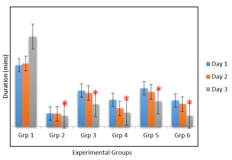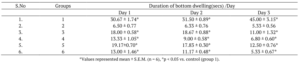 The test fish Danio rerio incited with lead (Pb) was exposed to the standard antidepressant drug Sertraline (0.1,1 ug mL-1) and Lactobacillus isolate (50,100 ug mL-1) to assay the behavioural pattern and is represented in Table 5. After 72h of treatment phase, the erratic behaviour of the stressed fishes exhibited altered behavioural responses. During the initial seconds of exposure time all tested concentrations showed a rapid movement, with faster opercular activity, hyper excitability and tendency of escaping from the (Pb) toxicant water. Gradually, hyper behavioural activities relatively increased and successively reduced expressing the sign of distress. Besides this, an interesting observations was that the fish had visible increase in depigmentation along with abundant mucus secretion widely over the body with an increased exposure time. At the end of exposure (24h) period, the group without treatment struggled hard for breathing, with their reduction of swimming performance. The fish laid down on the bottom of aquaria under the exposure of heavy metal and this was assayed by novel tank method. These behavioural effects ultimately reduced in the low concentration of Sertraline and Lactobacillus isolate (Figure 3).