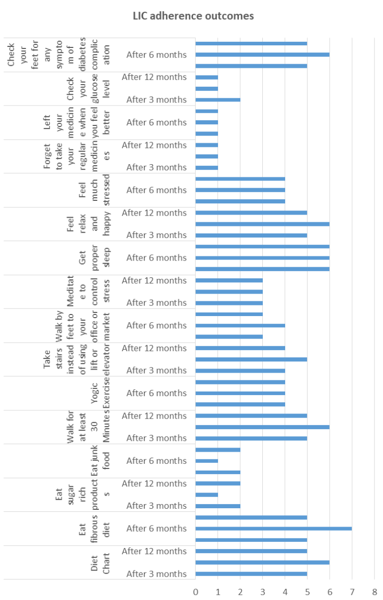 The patients’ adherence to taking stairs instead of using lift or elevator (4.38 ±1.15 6 month-4.89 ± 1.13 and at 12 4.35 ± 1.21) and they use to take feet to go to their office or market (3.08 ± 0.75 6 month 4.05 ± 1.17 and 12 month 3.06 ± 0.76). Also significantly increased from 3rd month to 12 month of follow-ups. A significant adherence also observed in LIC group patients, they reduce smoking, chewing tobacco, and alcohol consumption after motivational counseling by the diabetes educator They left tobacco, smoking, and alcohol even they had a strong feeling to consume it. At baseline, very few patients were adhering to do meditation, after meditation counseling few more patients follow meditation practice but not reach the statistical level. After motivational counseling, the patient gets proper sleep as compare to before and feel relax and happy. The mean difference observed in the adherence to taking regular medicines in the LIC but not reach the statistically significant level from 3rd month to 12 month of follow-ups. Minimum days to forget to take medicines were observed at 3 month with lower mean and almost similar at 6 month. Few patients left medicine when you feel better but Maximum improvement was observed at 6 month. A significant adherence to check feet for any symptom of diabetes complications was observed LIC group patient but the Maximum adherence scores were observed at 6 month about 6 days out of 7 days of a week.