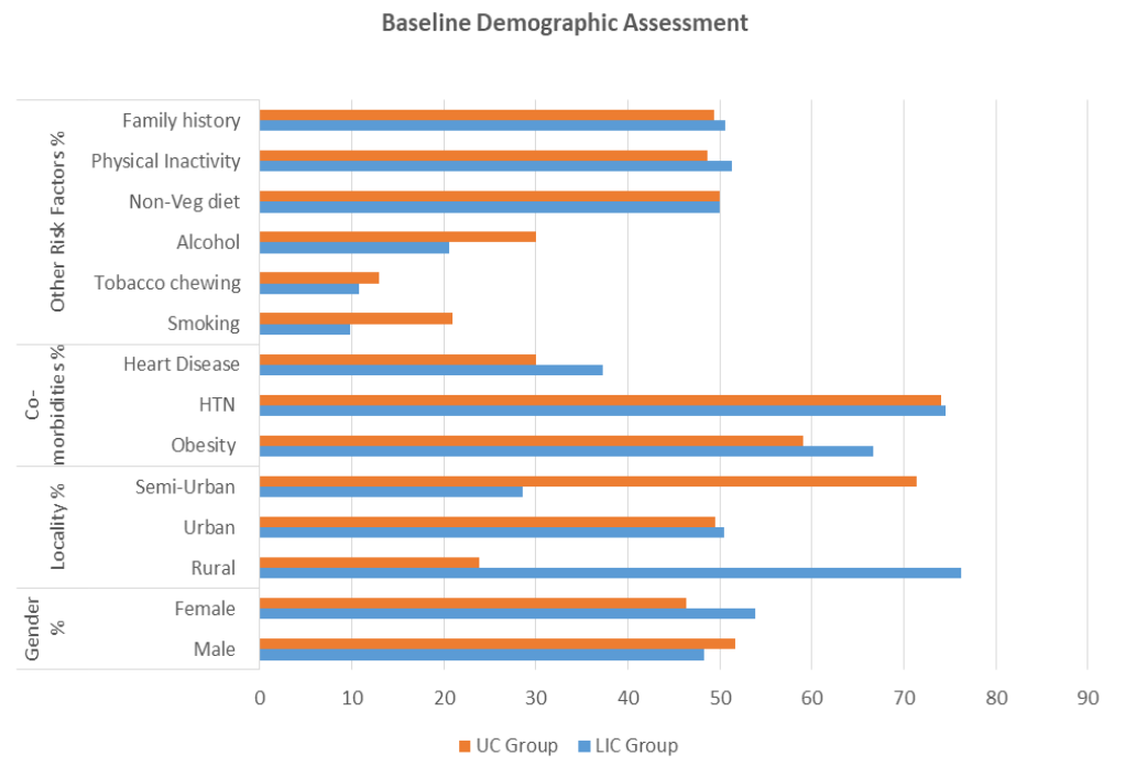 In the present study, the data of 202 participants were analyzed. The mean age of the LIC group patients was 51.4 ± 9.3 and UC group patients were 54.0 ± 8.6 with an age range from 35 to 70 years. The number of male participants was higher 118 (58.4%) than females’ participants 84 (41.6%). A maximum number of participants belonged from urban (111) areas as compared to rural and semi-urban 42 and 49 respectively. The average duration of diabetes of the LIC group was 7.93 ± 6.4 and the UC group was 7.88 ± 5.9. In this study out of 202 patients, 127 patients were obese, 150 having hypertension, 68 patients were having heart disease. Out of 202 patients, 77 patients were having a history of diabetes, in which 39 patients from the LIC group and 38 from the UC group. Out of total patients, 112 patients were Non-vegetarian, 89 was a vegetarian and one was Vegan. Out of total patients, 31 patients were smokers, 24 patients had the habit of tobacco chewing, and 51 patients consumed alcohol in excess amount and 114 patients had no personal habits of tobacco and alcohol. At baseline assessment, 87 patients were physically active, in which 43 patients in the LIC group and 44 in the UC group. Out of 202 patients, only 23 patients were performing meditation to control stress and only 35 patients have monitored their blood glucose regularly at baseline. The data of demographic profile and baseline assessment of LIC and UC are summarized in Figure 1.