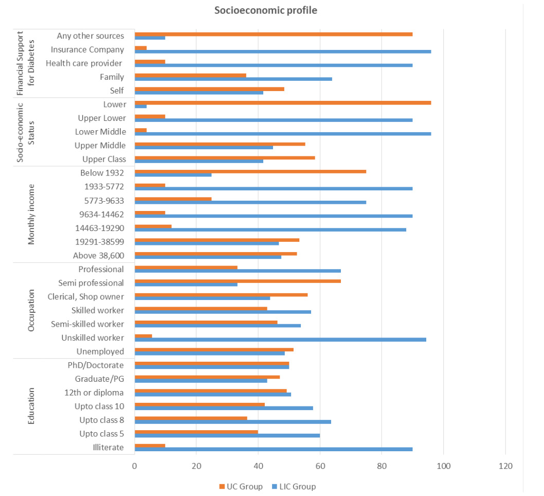 Out of 202 patients, 69 patients were 12th or diploma holders followed by 63 were Graduate/Postgraduate, 45 Up to class 10 education, 10 Up to class 5 education, 2 Illiterate, and 2was Ph.D./Doctorate. In this study, participants belong to various types of occupations. Out of 202 patients, 70 (34.6%) patients were unemployed (retired and females) followed by41 (20.2%) clerical/shop owner, 36 Semiprofessional, 21 skilled workers, 18 skilled workers, 13 skilled workers, and 3 was Professional. Out of 202 patients, 75 patients from the income group of 19291-38599 INR followed by 61 patients from income group of > 38,600 INR, and 25 patients from the income group of 14463-19290 INR. Out of 202 patients, 96patients belong to the Upper Middle class followed by77 Upper Class, 25 Lower Middle class, Upper Lower class, and 1 from the Lower class. Out of 202 patients, 125 patients were self-supporting for their finances for Diabetes however 72 patients were supported by their families, 3 by the health care provider, and one by the Insurance Company. The socioeconomic profile of LIC and UC groups are summarized in Figure 2.