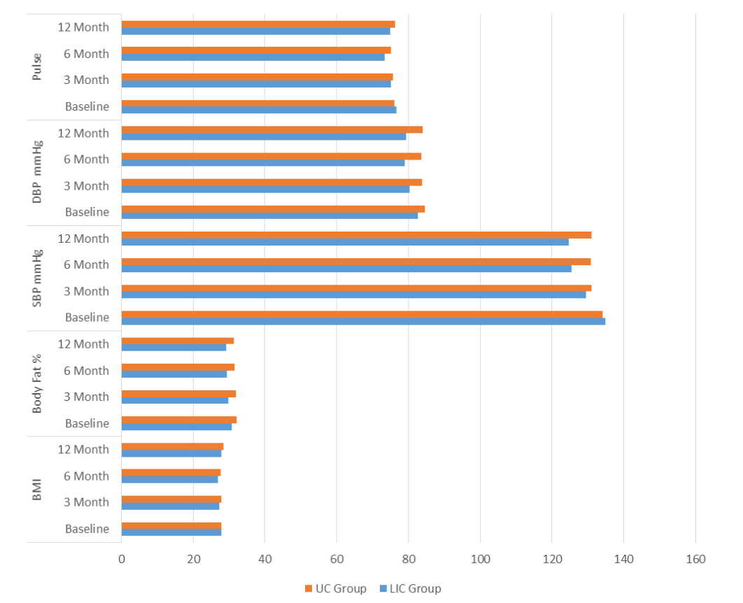 A statistically significant improvement was observed in Body Fat% at 3rd (30.7 ± 5.5 to 29.9 ± 5.1) 6th month (30.7 ± 5.5 to 29.4 ± 4.4) and 12 month (30.7 ± 5.5 to 29.2 ± 3.8) from baseline, within the LIC Group. A significant improvement was observed in SBP at 6th (125.5 ± 9.7 vs 130.9 ± 11.3) and 12 month (124.7 ± 9.5 vs 131.1 ± 11.9) between the LIC and UC Group and also a significant improvement was observed in DBP at 3rd (134.9 ± 16.0 to129.5 ± 13.1), 6th month (134.9 ± 16.0 to 125.5 ± 9.7) and 12month (134.9 ± 16.0 to 124.7 ± 9.5) from baseline. There was a statistically significant improvement observed in pulse rate from baseline to 3rd (82.6 ± 7.0 to 80.3 ± 6.04), 6th month (82.6 ± 7.0 to 78.9 ± 4.8) and 12month (82.6 ± 7.0 to 79.4 ± 6.1). The follow ups of physiological parameters (BMI, Body fat, SBP, DBP and pulse) of the LIC and UC groups are represented in Figure 3.
