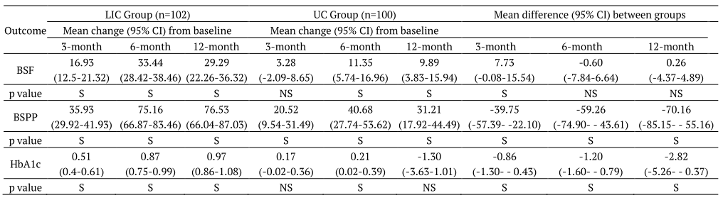 BSF-Blood sugar fasting, BSPP- Blood sugar postprandial, HbA1c- Glycated hemoglobin, S-Significant, NS-Non-significant, Means differences within and between-group are in mean (95% Confidence Interval), a negative change indicates a fall on average from baseline to 3 months, baseline to 6 months and baseline to 12 months. Determined repeated measures ANOVA within and between groups comparison and multi-variant analysis for significant change at p < 0.05.