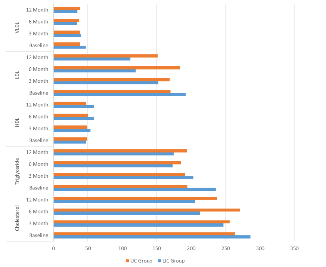 A statistically significant reduction in total cholesterol was observed at 3rd (286.4 ± 103.2 to 247.1 ± 80.1), 6th month (286.4 ± 103.2 to 213.2 ± 83.9) and 12month (286.4 ± 103.2 to 205.8 ± 56.9) from baseline, within the LIC group while there was an insignificant incensement observed in the UC group. A significant improvement in triglyceride and HDL was observed at 3rd, 6th, and 12month from baseline, within the LIC group while no statistically significant differences observed in the usual care group. There was a statistically significant difference was observed in LDL cholesterol at 6th (119.5 ± 80.7 vs 183.7 ± 96.5) and 12 month (111.9 ± 54.8 vs151.5 ± 77.4) between the LIC Group and UC Group. There was a statistically significant difference observed in VLDL cholesterol at 3rd (47.13 ± 22.9 to 40.64 ± 17.4), 6th month (47.13 ± 22.9 to 34.57 ± 12.5) and 12month (47.13 ± 22.9 to 35.0 ± 8.2) from baseline, within the LIC group while no statistical significant differences observed in the usual care group. The data of lipid profile (Cholesterol, Triglycerides, HDL, LDL and VLDL) and follow ups (baseline, 3, 6, and 12th month) of the LIC and UC groups are summarised in Figure 4.