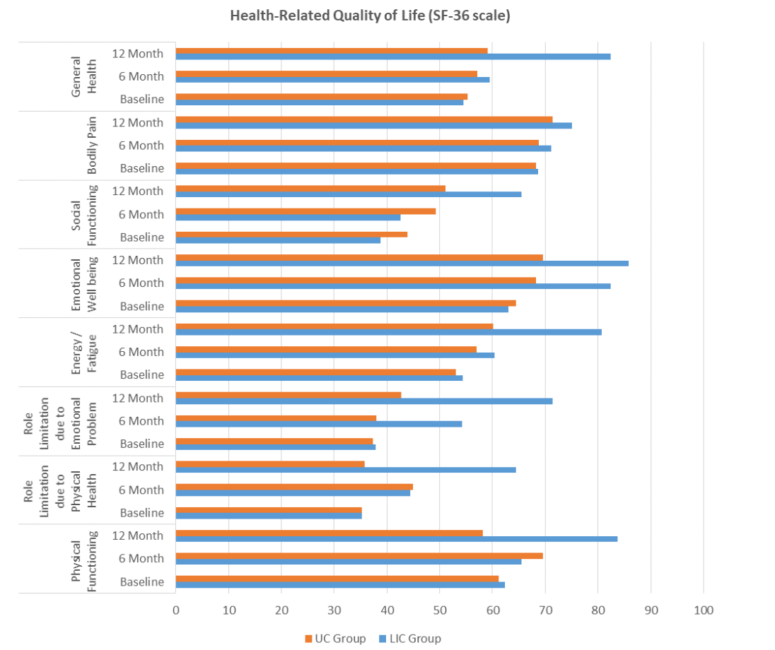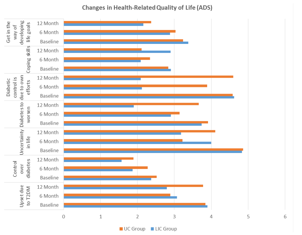 A study by Kuznetsov concludes that there is a very strong relationship between glycemic control and HRQoL which means if the patient has a high blood glucose level experience a poor HRQoL due to the complications. The present study showed a significant improvement in HRQoL in all the domains of the LIC group as compared to the UC group follow-ups. Studies conducted by Guldbrand et al. (2014) and Snel et al. (2012) support the present study and found a significant improvement in HRQoL after adhering to a low fat and calorie diet, with physical exercise for 12 months.