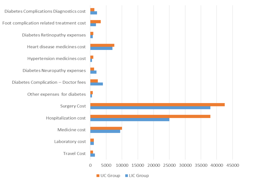 There was a mean change observed in some other variables cost in INR such as diabetic neuropathy expenses (UC vs LIC ) (307 vs 184.3), hypertension medicines cost (257.8 vs 173.8), diabetes retinopathy expenses (39.0 vs 14.7), foot complication related treatment cost (305.5 vs 137.8), other expenses for diabetes (340.0 vs 173.5), but these changes or reduction did not reach to the statistically significant level. Although the LIC group spends more money for doctor’s consultation fees for diabetic complications because of the LIC group have more participants with comorbidities and diabetes-related complications. The cost of travel, diabetes complication diagnosis and heart disease medication was a little higher in the LIC group due to the higher number of heart disease participants in the LIC group as compared to the UC group. The data of medical ttreatment cost of LIC & UC groups are summarized in Figure 7.