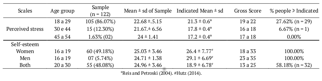 According to Potter and Perry (2018) the relevant stressors for self-esteem can change throughout development and growth, and such changes can trigger the decrease of this factor in adulthood. Socio-economic issues, work and love problems are some examples of stressful conditions. Students can suffer interference from other factors, such as, issues concerning their own body image, attempts to please parents’ expectations, problems with romantic relationships and economic vulnerability, which can be justified based on part of sampling having low self-esteem, such as undergraduate students (n = 67) and 100% of sampling being below levels considered as acceptable for non-students.