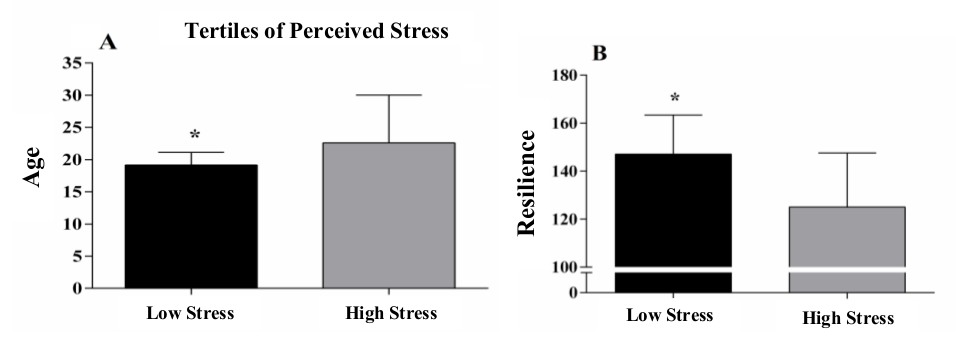 The comparison of tertiles of perceived stress between groups demonstrated that less stressed students were younger (19.16 ± 1.97 years old vs 22.58 ± 7.45; p = 0.030) (Figure 1A) and had higher resilience score (147.09 ± 16.32 vs 125.08 ± 22.50; p < 0.001) (Figure 1B).