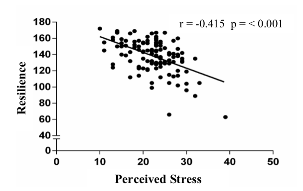 The comparison of tertiles of self-esteem demonstrated that students with better self-esteem had better resilience (146.0 ± 17.65 vs 133.85 ± 24.84; p = 0.037) (Figure 2). Spearman’s correlation showed a negative relation between resilience score and perceived stress (r = -0.415 p = < 0.001) (Figure 2).