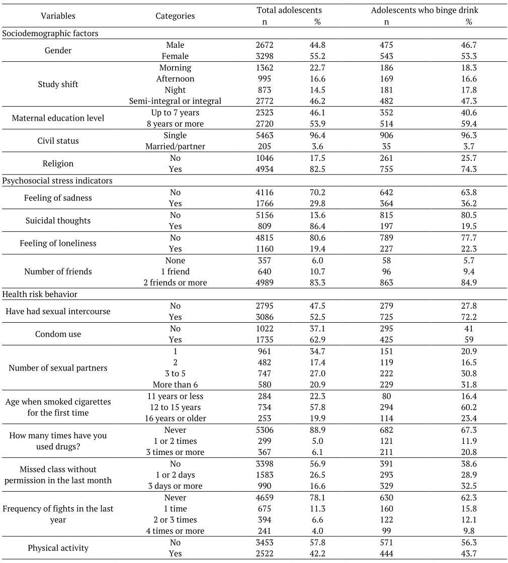 The prevalence of alcohol consumption and binge drinking behavior was high. Sociodemographic factors, psychosocial stress indicators and health risk behaviors were associated with binge drinking. Monitoring trends in health risk behaviors in the adolescent population can help identify potential preventive strategies and reassess existing ones. Thus, the results of this study may contribute to implementing and evaluating specific public policies which fully assist adolescents, as well as guiding health and education professionals who work in health promotion and disease prevention programs which can be carried out by health agencies in developing actions to reduce factors associated with alcohol consumption among adolescent.