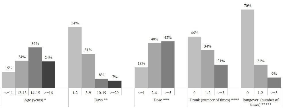 Of the adolescents interviewed, 75% had already consumed alcohol at some time in their lives. Of these adolescents, 36% consumed alcohol for the first time between 14 and 15 years old. In the 30 days prior to the survey, 54% of the adolescents consumed one or two doses of alcohol. In contrast, 46% of adolescents reported never having been drunk and 70% never had a hangover (Figure 1).