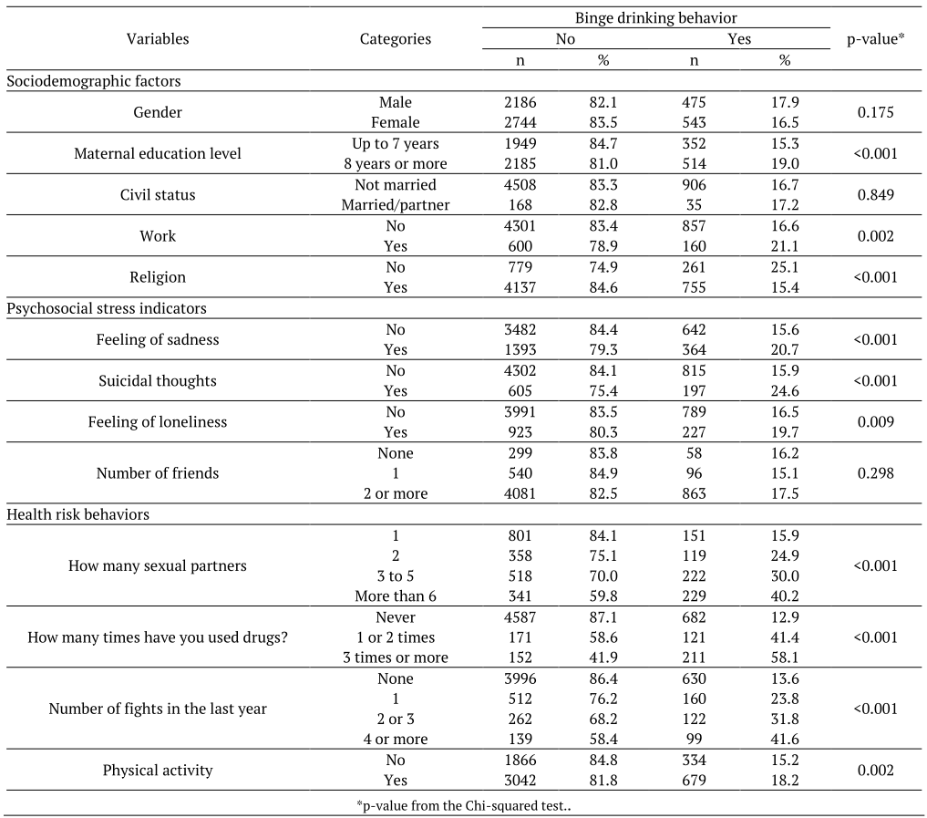 The cross-sectional design of this study is cited as a main limitation, which makes it impossible to establish a temporal relationship between most of the independent variables and binge drinking behavior. Due to the literature showing a reciprocal relationship between these behaviors, further studies with a longitudinal design are suggested for better understanding. Another limitation is the possibility of information bias, which can cause the prevalence of substance use to be underestimated when investigating behaviors which are not socially accepted through self-reporting, even though this is anonymous. It should also be noted that not all the possible factors associated with binge drinking were analyzed, such as low school performance, sexual violence, among others. However important factors involving different domains were tested in this study, including: sociodemographic factors, psychosocial stress indicators and health risk behaviors.
