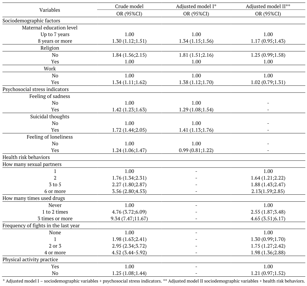 The following factors associated with binge drinking were identified in the bivariate analyzes: (i) sociodemographic - maternal education > = 8 years, working, not having religion and not practicing physical activity; (ii) psychosocial stress indicators - feelings of sadness, suicidal thoughts and feelings of loneliness; (iii) health risk behaviors - having more than one sexual partner, having used drugs and having been involved in fights in the last year (Table 2). Next, two models were proposed in the adjusted analysis. Sociodemographic factors and psychosocial stress indicators were analyzed in the first model. Adolescents in which the mother had more than eight years of study were 34% more likely to present binge drinking behavior.Adolescents without a religion were 81% more likely to consume alcohol in excess. Similarly, working teenagers were also more likely to binge drink. The chance for teenagers who feel sad to binge drink is 29% higher and teenagers who have already thought about suicide are 41% more likely to drink to excess (Table 3).