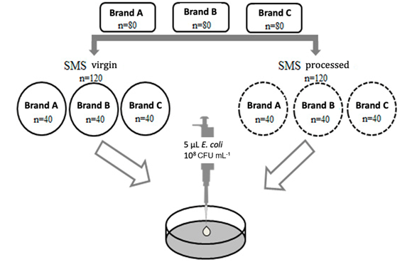 The analyzes were performed using the statistical software SPSS version 21.0 (SPSS, Chicago, IL, USA). Descriptive frequency analyzes were performed and the chi-square test of independence was used to assess the association between the variables brand and condition (virgin and processed) of the SMS with the outcome (penetration or not of the bacterium). The level of significance used was 0.05 (p < 0.05).
