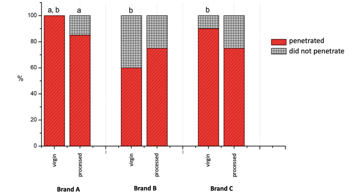 It was also evaluated whether, for the same brand, there is an association of penetration with the SMS condition, obtaining the following p values: brand A = 0.035, brand B = 0.311 and brand C = 0.184. Thus, there is an association of bacterial penetration with the condition of SMS only for the A brand.