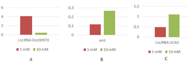 The expression level in 5-Azacytidine-treated samples of LncRNA Linc00979 LncRNA UCA1 with a concentration of 1 mM with p < 0/05 was meaningful and showed a higher expression than the samples treated with a concentration of 10 mM. Wnt gene expression level was also measured after treatment with different concentrations of the 5-azacytidine drug, the amount of which was meaningful with p < 0/05. In other words, Wnt levels were significantly decreased in the cells treated with different concentrations of the drug compared to untreated cells. HT29 cell line was treated with 1 and 10 mM of 5-azacytidine, then RealTime PCR was done in pursue of Wnt gene expression fluctuation level. Interestingly, we realized that at concentrations of 1 and 10 mM of the drug we have had reduced Wnt expression, but to our amazement the decline in Wnt expression at 1mM concentration was much greater than 10 mM. HT29 cell line was treated by 1 and 10 mM of 5-Azacytidine for the aim of investigating the expression changes in LncRNA Linc00970 post-treatment via Real-time PCR. as a result, there were no changes in the expression level of lncRNA linc00970 at 10 mM concentration of 5-Azacytidine but its expression rate had increased at 1 mM of drug concentration. Subsequently, LncRNA UCA1 expression level post-treatment was evaluated. For this reason, the HT29 cell line was treated by 1 and 10 mM of 5-azacytidine. It was understood from the results that in 10 mM of 5-azacytidine-treated cells the expression rate of LncRNA UCA1 had no change while a decrease was detected in the LncRNA UCA1 expression after being treated by 1 mM of 5-azacytidine, in a contrary manner to LncRNA Linc00970. The fluctuations in the expression level of the Wnt gene, LncRNA UCA1, and LncRNA Linc00970 are presented in Figure 1.