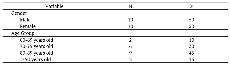 Table 1 shows the data related to the profile of the institutionalized elderly according to gender and age group. From the data obtained it was possible to verify an equality for sex, with 10 males (50%) and 10 females (50%). Regarding the age bracket, there was a greater number of elderly individuals in the 80 to 89 age group, with a percentage representation of 45%.