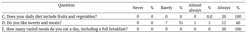 Table 2 presents numbers related to the nutritional aspects of the elderly interviewed. When asked about the intake of fruits and vegetables, all the 20 elderly (100%) stated that they ingested such foods on a daily basis. 12 elderly (60%) said they always eat meat and sweets. All the elderly (100%) said they had daily meals including a full breakfast.