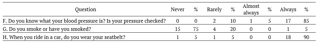Table 4 highlights aspects related to the public's preventive care, with 17 elderly people (85%) stating that they know their blood pressure levels and that they always have their blood pressure checked. Fifteen of them (75%) said they do not smoke or have smoked and 18 (90%) reported always using seat belts when using vehicles (cars).