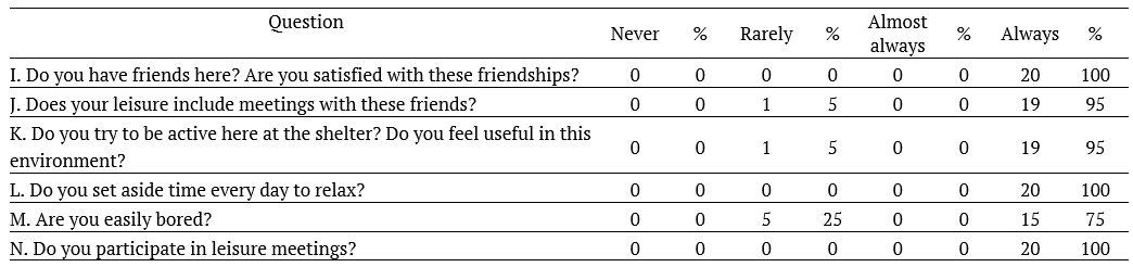 Table 5 shows that all the elderly reported being satisfied with their friendships, and 19 elderly (95%) said they always include their friends in leisure gatherings. When asked about being active at the shelter and looking for activities to do, 19 of them (95%) said they always try to be participatory in the activities at the place. Regarding the data related to stressful factors for the elderly, all the interviewees (100%) said they set aside some part of their day to relax. 15 elderly people claimed to get bored easily. As for participation in leisure meetings, all 20 (100%) said they were present.