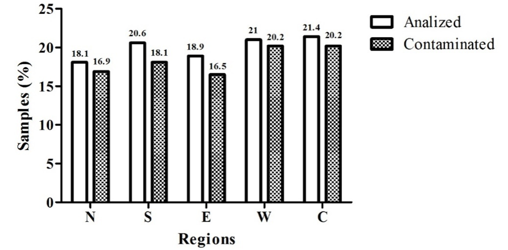 All regions had a high contamination percentage by some type of microorganism, those with the highest rates are the west, center and north regions with 96, 94 and 93%, respectively. While the lowest indexes are in the southern, with 88%, and east, with 87%.
