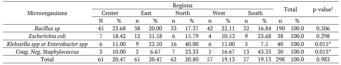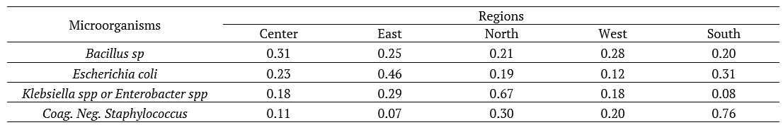 When comparing the microorganisms separately by region, a statistically significant difference is observed for Klebsiella spp or Enterobacter spp, with a p-value equal to 0.015, and coag. neg. Staphylococcus, with p-value of 0.013. The highest percentage of Klebsiella spp or Enterobacter spp was found in the North, corresponding to 40% of the total of 40 identified items. Regarding coag. Neg. Staphylococcus, the highest percentage was identified in the South, representing 43.33% of the total of 30 identified items, as it can be seen in Table 1.