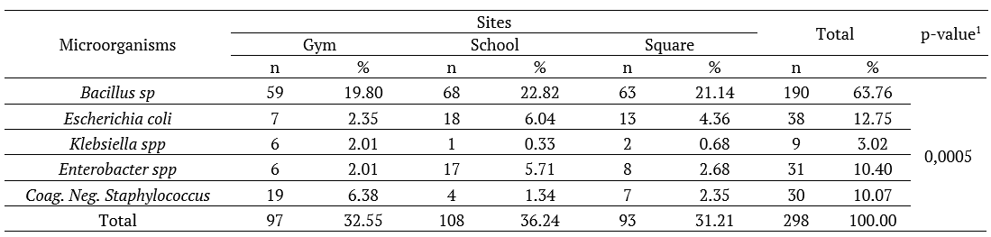 Table 2 shows the absolute and relative frequencies of the microorganisms present in the three sites evaluated in the different regions of João Pessoa. It is observed that Bacillus sp are more frequently present in the items of the three locations (gym, school and square), corresponding to 63.76% of the total identified microorganisms in the items. It is also possible to verify that, in second place, at the gym, the most commonly found microorganism was coag. neg. Staphylococcus (6.38%), while at the school and square, the second most frequent microorganism was Escherichia coli, with values of 6.04% and 4.36%, respectively. The Chi-square test showed a p-value of 0.0005, which results in a strongly significant difference (at the level of 1% of significance) between the types of microorganisms and the locations in which they were found.