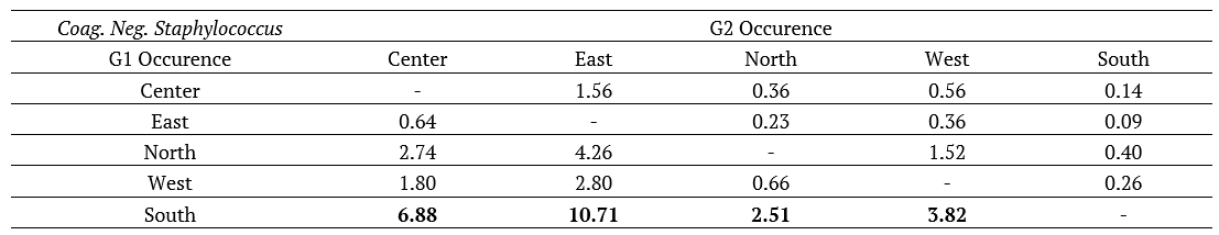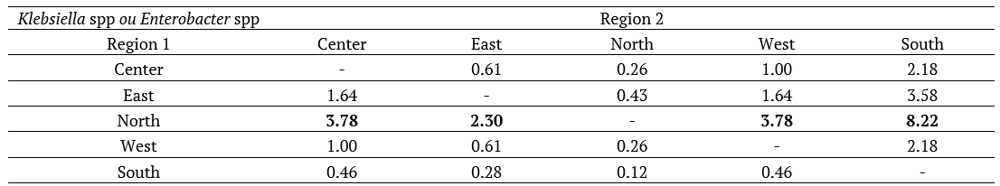 As mentioned, the microorganisms that showed a significant difference between the regions were Klebsiella spp or Enterobacter spp and coag. Neg. Staphylococcus, and these were selected to calculate the odds ratio in order to identify which region is most likely to have such microorganisms. Tables 4 and 5 show such results. Thus, it is observed that for Klebsiella spp or Enterobacter spp the North region is the place that has the greatest chance of identifying such microorganisms, with odds ratios varying between 2.30 (compared with the Eastern region) and 8.22 (compared with South region). Regarding coag. Neg. Staphylococcus, it is observed that the greatest odds ratios are found in the South region, with a variation between 2.51 (compared to the North region) and 10.71 (compared to the East region), that is, in this region there is a greater chance of identifying such a microorganism.