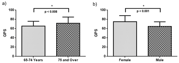 The Geriatric Pain Measure's mean points were higher for those aged over 75 years than 65-74 years and for female participants in the research. There were statistically significant differences identified between mean points (p < 0.05) (Figure 1).
